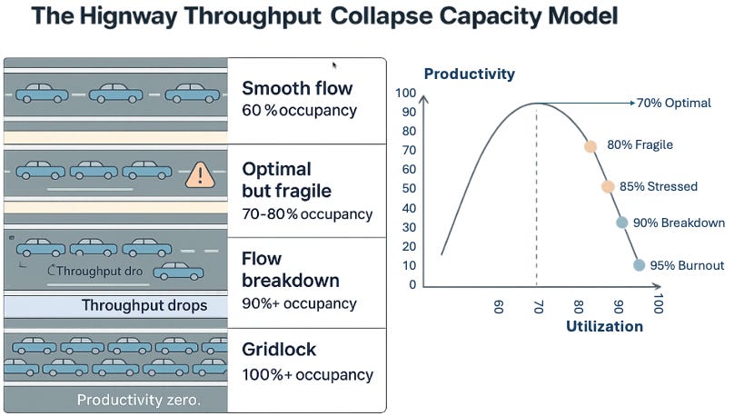 On the left, under‑utilization wastes resources. In the middle, productivity climbs as you load people and assets up to roughly 70 - 80% of capacity. Add another 10% and you shift from flow state to knife-edge. Cram in the final 10%, and the curve doesn’t plateau, it nose‑dives. Quality erodes; re‑work devours bandwidth, decision-making clouds, and resilience evaporates just when it’s needed most.